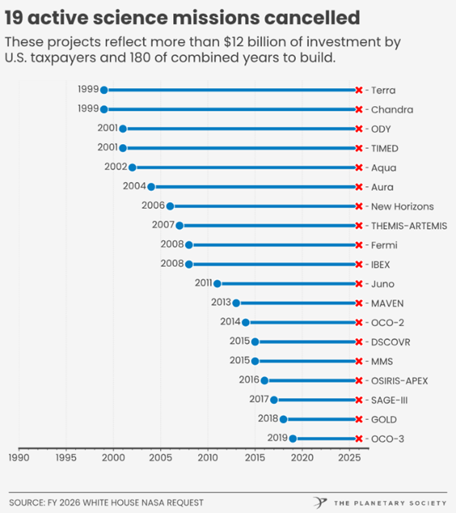 I am writing to express deep concern with the recent Presidential Budget Request (PBR) which includes severe cuts across NASA particularly targeting the Science Mission Directorate. The proposed budget includes the termination of 19 active science missions (illustrated below), consequently wasting billions of taxpayer dollars that have already been invested. More specifically, NASA’s Biological and Physical Sciences Division (BPS), which funds my current research and future work, faces a draconian 72% reduction in funds from $87.5M to just $25M. This budget includes only $13M for Physical Sciences research, $4M for Space Biology, and $4M for the Commercially Enabled Rapid Space Science Initiative (CERISS) initiative.