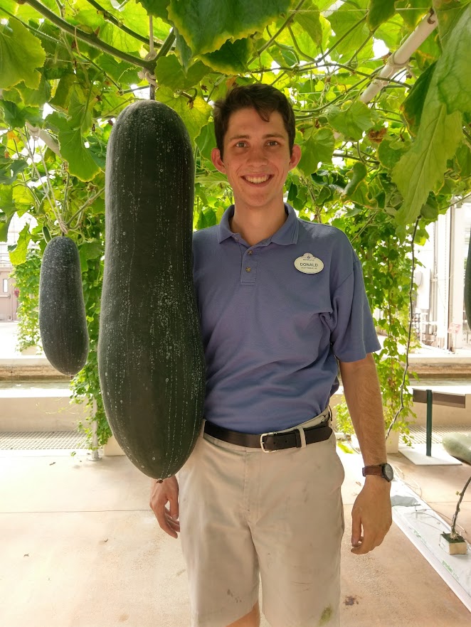 Me next to a gigantic winter melon grown in the Living with the Land Greenhouses. Makes great soup and candy.