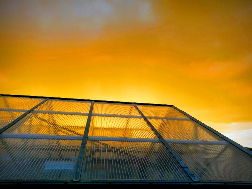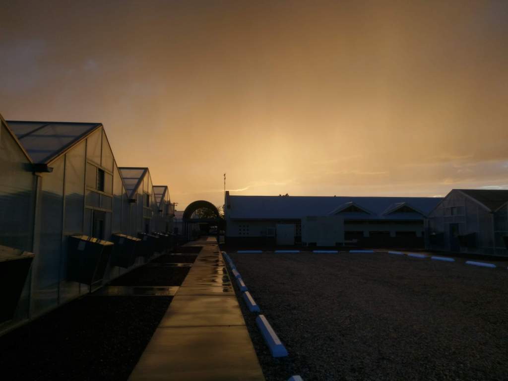 A Tucson sunset shining through one of the greenhouses at the Controlled Environment Agriculture Center.