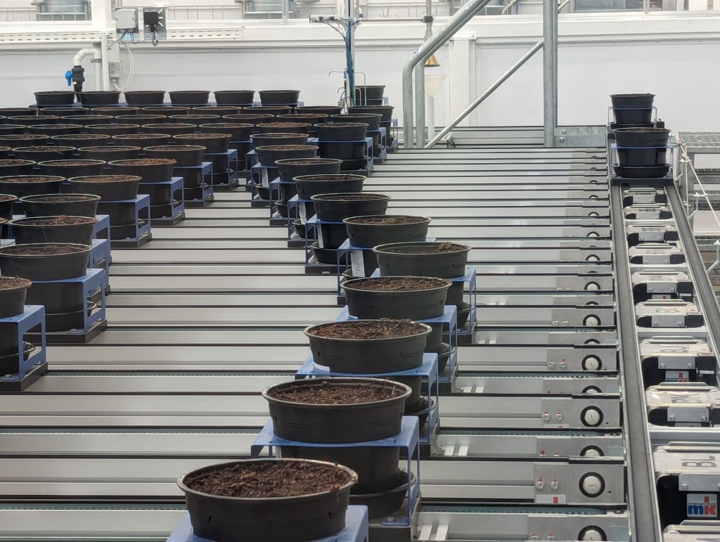 Pots in a high throughput phenotyping facility at Wageningen University and Research moving from one greenhouse to another.